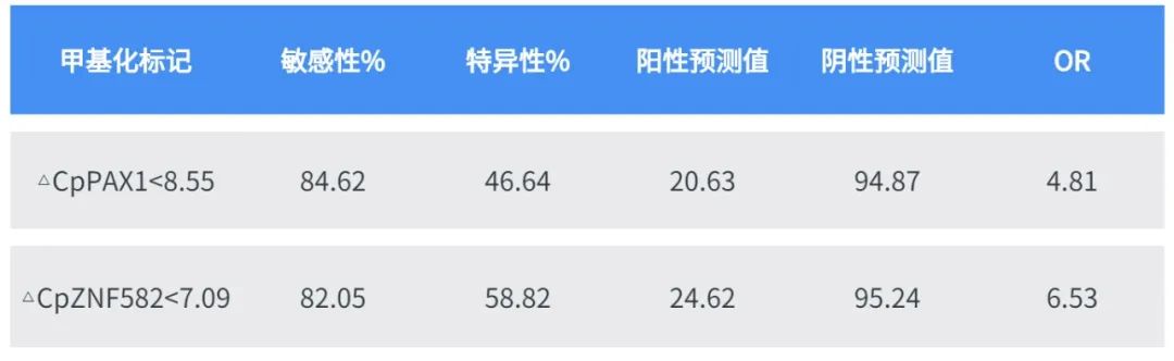 表1:PAX1m和(hé)ZNF582m預測SCC中的(de)臨床性能(néng)